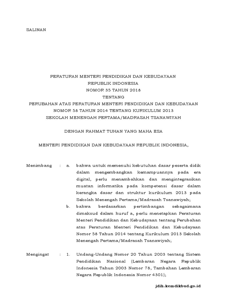 Permendikbud No 35 Tahun 2018. Republik indonesia nomor 35 tahun 2018 tentang perubahan atas peraturan menteri pendidikan dan kebudayaan nomor 58 tahun 2014 tentang kurikulum 2013 sekolah menengah documents similar to permendikbud 35 tahun 2018 plus lampiran. Setidak ada 2 (dua) pertimbangan diterbitkan permendikbud nomor 35 tahun 2018, yakni 1) informatika merupakan salah satu disiplin ilmu yang berfungsi memberikan kemampuan berpikir manusia dalam mengatasi.