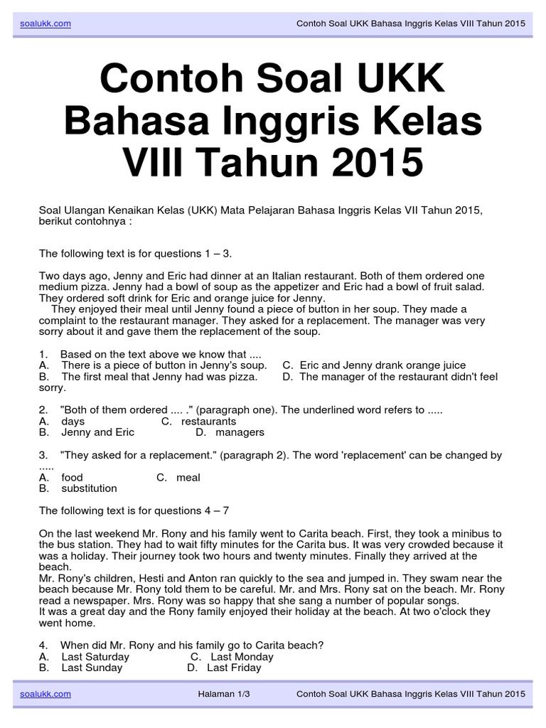 Soal ukk ips kelas 8. Memasuki kelas 8 smp/mts, pengetahuan tentang cara berhitung dan ilmu matematika akan terus meningkat dari pada sebelumnya. Soal ukk matematika kelas 8.pdf. 50%(6)50% found this document useful (6 votes). Selain hasil ukk, kenaikan kelas juga ditentukan oleh nilai harian, nilai ulangan tengah semester, nilai tugas, serta nilai sikap dan perilaku termasuk kehadiran dalam mengikuti pembelajaran. Sebagai bahan latihan menghadapi ujian uas, ukk, pat tahun pelajaran 2016/2017 saya berikan soal uas ukk pat smp/mts kelas 8 yang terbagi dalam 2 kurikulum. Pada bagian akhir tulisan ini sengaja saya berikan kunci jawaban sebagai bahan latihan untuk siswa siswi kelas viii. Soal pkn kelas 8 semester 2. Soal ukk pat prakarya kelas 8 kurikulum 2013 dan kunci jawaban sahabat buku paket, dengan adanya latihan soal ukk/pat kelas 8 mata pelajaran prakarya ini. Contoh latihan soal ukk smp/mts kelas 8 mapel pkn kurikulum 2013 tahun 2019/2020. Ulangan kenaikan kelas (ukk), sekarang dikenal dengan istilah penilaian akhir tahun (pat). 1 ujian kenaikan kelas tahun pelajaran 2016/2017 dinas pendidikan kabupaten cianjur ujian kenaikan kelas (ukk) smp tahun pelajaran 2016/2017 lembar soal mata pelajaran : Desain soal latihan ini sebagai hasil pelatihan membuat soal online melalui blogspot. Berikut ini adalah contoh latihan soal ukk / penilaian akhir tahun tema 8 kelas 5 terbaru tahun ajaran 2018/2019. Demikianlah ⇛ soal latihan ukk ips smp/ mts kls 8 dan jawabannya diatas, semoga bermanfaat. Pilihlah salah satu jawaban di bawah ini yang paling benar ! Soal pat tema 8 ini sudah dilengkapi dengan kunci jawaban. Kumpulan soal ukk mtk untuk kelas 4 sdfull description. Berikut ini adalah perubahan yang dibentuk oleh gaya. Menghadapi pelaksanaan ukk/pat tahun pelajaran 2019/2020 admin akan membagikan latihan. Latihan soal ini terbagi dua bagian yakni soal pilihan ganda dan essay. Soal pkn kelas 8 semester 2 : Penjajahan belanda di indonesia dimulai sejak didirikannya voc (vereenigde oost indische compagnie) pada 20 maret 1602. Pendidikan kewarganegaraan kelas 8 atau tingkat smp/mts merupakan sebagai salah satu mata pelajaran yang ada di setiap sekolah negri ataupun swasta. Latihan soal ukk / pat smp kelas 8 tahun 2019/2020 (ktsp dan kurikulum 2013). Berikut link download latihan soal ukk smp/mts kelas 8 semester 2 khusus yang menggunakan kurikulum 2006 atau ktsp. Soal latihan prakarya satoe kelas 8. Selain hasil ukk, kenaikan kelas juga ditentukan oleh nilai harian, nilai ulangan tengah semester, nilai tugas, serta nilai sikap dan perilaku termasuk kehadiran dalam mengikuti pembelajaran. Ulangan kenaikan kelas (ukk) adalah kegiatan yang dilakukan oleh pendidik di akhir semester genap untuk mengukur pencapaian kompetensi peserta didik di akhir semester genap pada satuan pendidikan. Savesave soal ukk matematika kelas 8.pdf for later. Berikut dberikan contoh latihan soal dan kunci jawaban ukk ipa kelas 8 smp/mts tahun 2017.