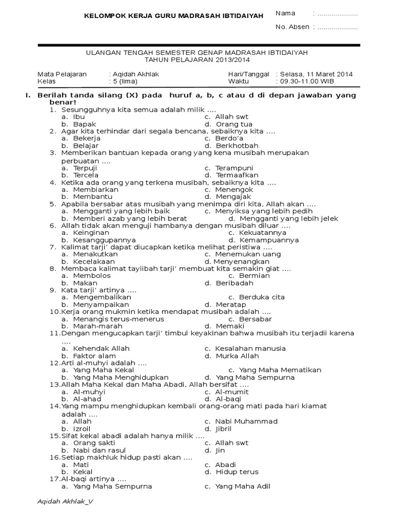 Aqidah berasal dari bahasa arab yaitu aqoda,ya'qidu,aqidatan yang berarti… a. Pada artikel kali ini saya akan membagikan soal uas akidah akhlak kelas 10 semester 1 kurikulum 2013 dan jawabannya kepada anda semua secara gratis. Darah haid yang keluar dari rahim seorang wanita pada umumnya berwarna. Soal ulangan tengah semester gasal madrasatah tsanawiyah tahun pelajaran 2010/2011 mata pelajaran aqidah akhlak kelas mata pelajaran aqidah akhlak. Iman kepada hari akhir adalah rukun iman yang ke.a. Download soal aqidah akhlak kelas x.docx. Iman kepada hari kiamat termasuk rukun iman yang ke …. Jumlah soal semuanya ada 55. Karamah contohnya adalah kejadian yang dialami oleh maryam binti imran ra., yang selalu mendapatkan makanan di mihrab, sedangkan maryam sendiri tidak pernah keluar dari mihrab. Selain itu juga anda bisa mendownload soal ulangan harian mata pelajaran dalam artikel yang berbeda. Berikut ini adalah beberapa contoh akhlak yang harus dimiliki oleh setiap remaja islam dalam bergaul,kecuali. Berikut bospedia memberikan soal uas aqidah akhlak kelas 4 sd/mi. Contoh soal ujian akhir semester ganjil mts kelas vii serta kunci jawaban. Kematian masal dalam kecelakaan b. Jelaskanlah pengertian sifat pandai ! Sebelum makan hendaklah kita mencuci … 2. Assalamu'alaikum wr.wb, halo para pencari edukasi selamat berkunjung kembali di blog yang sangat sederhana ini. Soal uas aqidah akhlak mi kelas 1,2,3,4,5,6 kurikulum 2013 semester 1 2018. Selamat datang di blog kumpulansoaltest. Salah satu contoh nikmat rohani adalah …. Contoh soal sebagai referensi untuk para guru tingkatan ma, sma, ataupun man. Di bawah ini yang merupakan contoh kiamat besar adalah. Yang dimaksud dengan akhlak terpuji adalah. Pilihlah salah satu jawaban yang benar pada huruf a,b,c atau d! Berikut ini yang dijadikan sebagai pedoman pokok bagi aqidah islam, adalah a. Segera palingkan muka ketika kita akan. Aqidah berasal dari bahasa arab yaitu aqoda,ya'qidu,aqidatan yang berarti… a. Jadi, bagi anda sebagai guru yang akan membuat soal cukup. Berilah tanda silang (x) pada huruf a,b,c atau d didepan jawaban yang kamu anggap benar ! Pada kesempatan ini kami akan share contoh soal aqidah akhlak kelas 9 mts kurikulum k13 semester ganjil 2017 lengkap. Dalam postingan ini saya sediakan lengkap untuk soal akidah akhlak mi kelas 1,2,3,4,5,6 kurikulum 2013 dan ktsp.