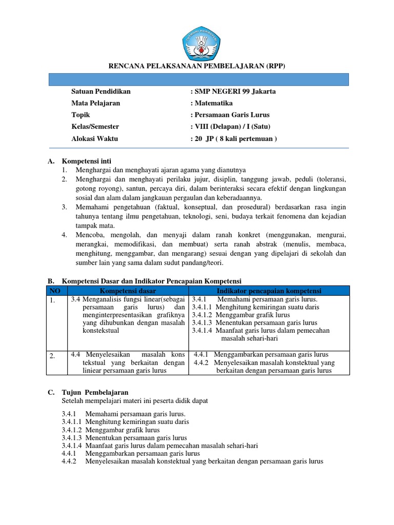Rpp Persamaan Garis Lurus Smp Kelas 8 K13 Revisi 2017