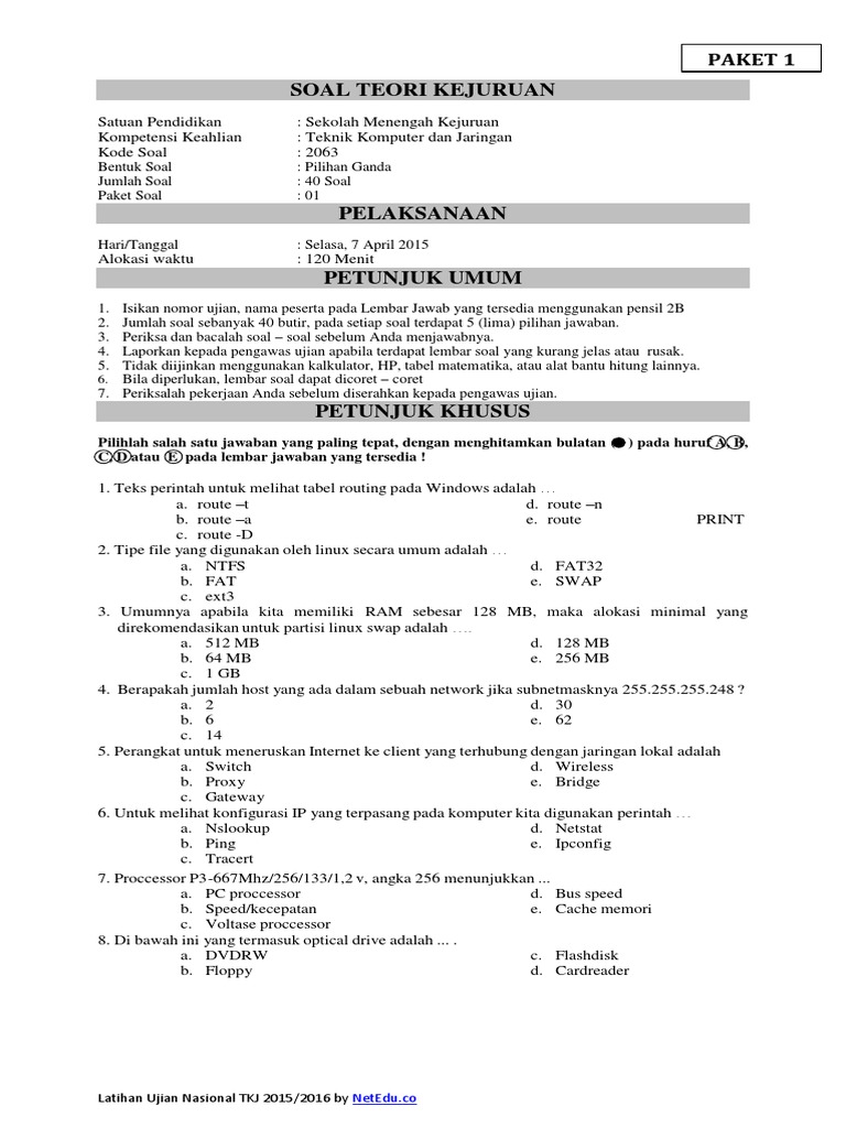 Dan tak jarang soal manajemen yang kami bagikan ini akan keluar saat uas nantinya. Berilah tanda silang (x) didepan huruf a,b atau c didepan jawaban yang benar ! Pilih jawaban yang menurut anda benar 4. Aplikasi soal unbk (ujian nasional berbasis komputer) sd 2018 (kunci jawaban) ini pun dilengkapi informasi yang dapat dibaca setiap siswa mengenai peraturan atau kebijakan baru tentang pelaksanaan soal un sd 2018 unbk (ujian nasional berbasis komputer). Semoga kumpulan latihan soal un 2018 yang kami sajikan ini dan telah memenuhi unsur prediktif dan evaluatif dapat sedikit banyak membantu anda nantinya dalam menghadapi un 2018. Elektrolisis larutan yang menghasilkan oksigen di anode adalah larutan yang mengandung ion sisa asam oksi atau hidroksida. Agustus 2019] sejak 2016 sampai sekarang kemendikbud menyelenggarakan ujian nasional dalam rangka persiapan un tahun pelajaran 2019/2010 baik unbk atau unkp berikut kami sediakan bebarapa file soal, kunci jawaban dan. Isikan nama lengkap anda dengan benar. Bacalah setiap soal dengan teliti. Network id dari alamat ip router 172.16.28.1 adalah. Jawaban 2019 2 soal dan kunci jawaban ujian. Cara hidup yang tidak a. Untuk mempermudah kalian dalam mengerjakan soal ujian akhir madrasah berbasis nasiona (uambn) kali. Untuk tema 8 subtema 1 sendiri judul tema yang akan di pelajari ialah aku anggota pramuka. Guna memberikan sarana latihan berikut ini admin sharekan soal latihan un unbk usbn bahasa indonesia untuk sma prodi bahasa tahun 2020 tahun pelajaran. Pada postingan kali ini kami akan berbagi soal latihan ujian nasional tkj, semoga bermanfaat untuk memantapkan siswa smk tkj dalam mempersia. Contoh soal usbn produktif teknik komputer jaringan kelas 12 smk tahun 2019 i. Tanggal dan waktu kapan dilakukan maintenance. Dan tak jarang soal manajemen yang kami bagikan ini akan keluar saat uas nantinya. Pilihlah salah satu jawaban yang benar dengan memberi tanda silang (x) pada huruf a, b, c, d dan e! Tujuannya adalah untuk membangun dan merancang sebuah jaringan yang sangat efektif. Olahraga yang teratur dan benar b. Motivasi merupakan cara efektif untuk menggapai prestasi. Pola hidup sehat adalah… a. Ingat, selalulah belajar, belajar dan belajar serta teruskan kemampuan memecahkan soal dengan memperbanyak. Written by admin wednesday, october 31, 2018 add comment edit. Cmd atau command promp merupakan sebuah perintah dos yang ada di windows yang dapat diakses secara. Latihan soal pas/uas matematika kelas 7 (vii) smp/mts semester 1 kurikulum 2013 disertai kunci jawaban dan pembahasan. Prediksi soal un dan unbk bahasa indonesia smk. Home › soal dan kunci jawaban › soal ujian nasional › soal un tkj. Kami berusaha, mulai tahun depan soal un tidak lagi pilihan ganda sehingga dapat mengukur level kognisi siswa lebih mendalam, ujar kepala pusat penilaian pendidikan kementerian pendidikan dan kebudayaan, nizam, dalam konferensi pers di jakarta, kamis, 15 juni 2017.