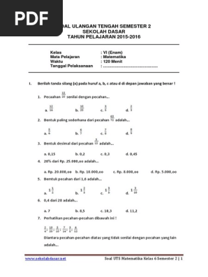 Soal uts sd kelas 6 kurikulum 2013 matematika semester 1.