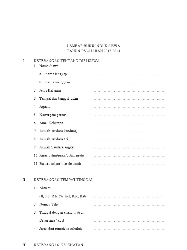 Format Buku Induk Siswa. Contoh format buku induk murid. Download format buku induk siswa kurikulum 2013 ini ditujukan bagi siapa saja yang membutuhkan informasi pendidikan aplikasi dan administrasi untuk digunakan sebagai demikianlah kiranya uraian artikel tentang format buku induk siswa tk sd mi mts smp sma smk pada kesempaan kali ini.