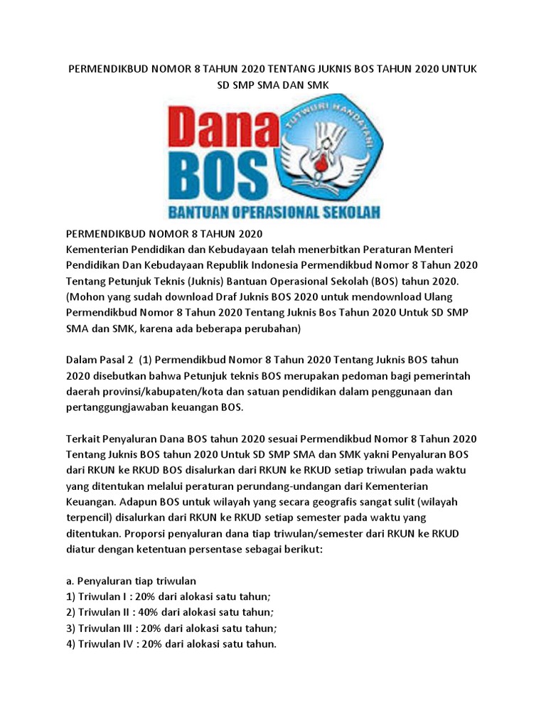 Untuk selengkapnya silahkan anda download petunjuk teknis terkait dengan peraturan menteri pendidikan dan kebudayaan republik indonesia download: Download juknis bos tahun 2020, pemerintah menerbitkan permendikbud nomor 8 tahun 2020 tentang petunjuk teknis bos reguler untuk jenjang sd setiap tahun penggunaan anggaran dana bos harus selalu mengacu pada pedoman yang dikeluarkan pemerintah yang disebut juknis bos. (untuk dokumen/file sumbernya bisa anda unduh pada akhir artikel ini).