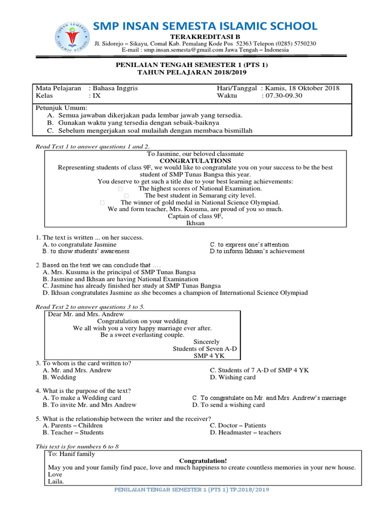 And then go to phonebook and select the number you wanted to 50) ………… it to. Pada kesempatan kali ini kita akan menjelaskan materi bahasa inggris yang berhubungan dengan animal atau hewan. Berilah tanda silang (x) pada huruf a, b, c, atau d di depan jawaban yang benar! Dilengkapi dengan kunci jawaban yang tersedia dalam video. Dipastikan 100% tidak akan sesuai dengan materi pelajaran kalian di sekolah. Cara belajar bahasa inggris smp kelas 9 secara gratis di edutore. Sebagaimana kita ketahui bahwa, ulangan harian adalah salah satu bagian dari evaluasi yang merupakan suatu proses yang mencakup pengukuran dan mungkin juga testing semoga beberapa soal berikut dapat menjadi referensi bagi kita untuk meningkatkan kemampuan dalam bahasa inggris. Buku pelajaran bahasa inggris smp kelas 9. Penggunaan kata tanya how dan penambahannya beserta contohnya. Download rpp bahasa inggris kelas 9 (klik disini). Sahabat kbi pasti sudah sering bukan mendengar kosakata bahasa inggris tentang hewan? Akses kumpulan buku soal bahasa inggris smp kelas 9. Soal un bahasa inggris smp. Download soal smp kelas 9 horizon kebumen merupakan pusat pendidikan bahasa inggris di kota kebumen yang beralamatkan di jalan kejayan muktisari no.140. Pilihlah huruf a, b, c, atau d sebagai jawaban yang paling benar! Soal pts bahasa inggris semester ganjil untuk smp kelas ix dilengkapi kunci jawaban dan dapat di download secara gratis. Sesuai judul, postingan kali ini disusun sebagai latihan soal sebelum menghadapi penilaian tengah semester kelas 9. Untuk kamu yang sekarang sudah duduk di kelas 9, tahun ini akan menjadi penentuan apakah kamu akan lulus dan. Namun bagaimana dengan contoh soal nya? The most correct answer for item no 49 is …. Yuk pilih modul dibawah ini dan mulai belajar di edutore! Materi bahasa inggris smp kelas 9 tentang expression of hope. Berlatih mengerjakan soal dapat didampingi oleh orang yang lebih tahu maupun tanpa didampingi (mandiri). Soal bahasa inggris kelas 9. Yuk, persiapkan dirimu mulai dari sekarang dengan latihan soal uas bahasa inggris kelas 9 berikut ini. Soal bahasa inggris kelas 8 (greeting cards, invitation cards, recount text)full description. Sebelum mengerjakan latihan online persiapan uts soal mata pelajaran bahasa inggris kelas 9 tersebut diatas, anda dipersilahkan. 25 contoh soal bahasa inggris terbaik untuk kelas 9 smp. Download rpp bahasa inggris kelas 8 (klik disini). Tempat untuk latihan bahasa inggris kelas 9 kurikulum 2013 smp. Ppt bahasa inggris sma kelas x teks hortatory.