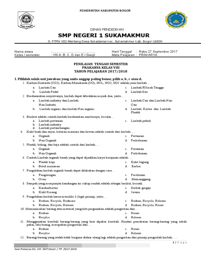 Semoga dengan latihan soal ini bisa menambah bahan belajar sahabat ahzaa yang nanti akan menghadapi uas/ pas semester 1. Pada artikel kali ini saya akan membagikan contoh latihan soal pas prakarya smp kelas 8 semester 1 kurikulum 2013 revisi tahun pelajaran yang mana soal pas prakarya ini admin bagikan menjadi 2 pemformatan file, yaitu soal online dan file pdf yang bisa sobat download secara gratis. 26 responses to soal pas pai kelas 8 semester 1 + jawaban th. Berikut dibawah ini soal dan jawaban prakarya kelas 8 semester ganjil kurtilas dimulai dari pertanyaan nomor satu.