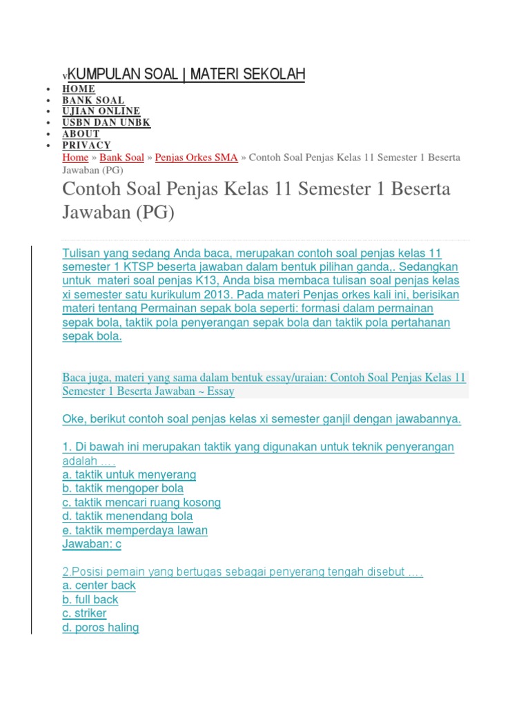 Soal Penjas Kelas 11. Baiklah langsung saja contoh soal penjas kelas 11 , semoga. Nah demikian ulasan yang mengenai soal penjaskes kelas 11 serta kami lengkapi dengan kunci jawaban nya, semoga apa yang kami.