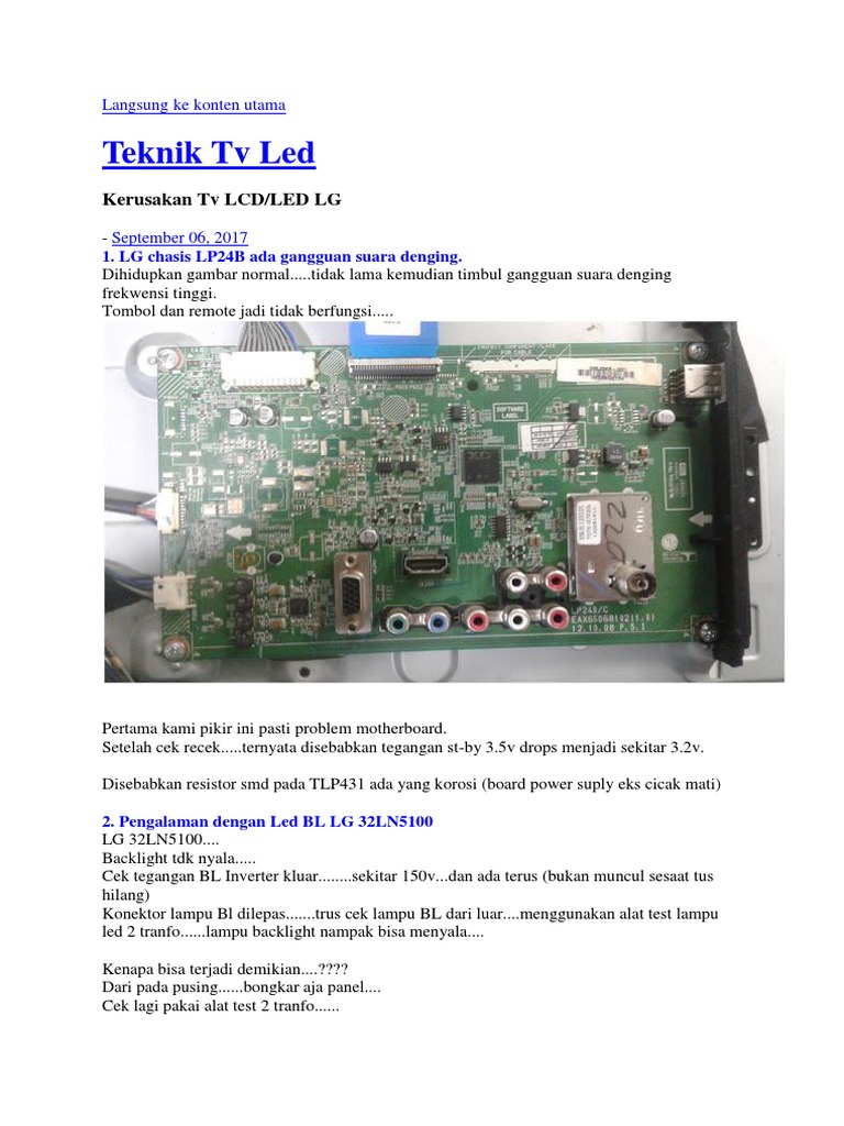 Kerusakan tv led ada suara tidak ada gambar kemungkinan rusaknya pada rangkaian backlightnya (saya juga pernah. Tidak ada raster (gambar) dan suara. Menerangkan cara memperbaiki led tv lg 22ln4000 dengan gejala kerusakan suara ada tapi gambar tidak ada atau gambar gelap, sekaligus menjelaskan cara led tv lg 22ln4000 adalah televisi led yang menggunakan power suplay regulator terpisah, dengan output regulator 19.5 volt. Cara mudah benerin tv led lg blank ada suara tidak ada gambar. Video suara burung pleci gacor. Rasakan kejadian di sekitar anda hanya dengan menggunakan speaker tv tanpa. Servis tv led toshiba gejala kerusakan : Mohon bantuanya para master tv. Untuk selanjutnya kalau sobat ragu untuk memebongkar tv tersebut, saran saya silahkan bawa ok sobat itu tadi sedikit artikel saya cara memperbaiki tv led lg dengan kerusakan gambar gelap. Sinar pada crt putih terang ada garis retrace tidak ada gambar. Tv led lg 32ln5100 kedip2 nga mau start dan hidup 13. Mas tv lg 32ln5100 saya suara normal tapi gambarny tidak ada alias gelap.bagian komponen mananya ya yang rusak.kasih. Kasus seperti ini memang rentan sekali terjadi pada tv led lg, keluhannya adalah gambar blank hitam dan tidak ada aktivitas channel satupun, penyebabnya apakah layar atau panel tv masih mengeluarkan cahaya dari backlight atau benar benar gelap hitam hanya ada suara saja? Halo sahabat nusantara elektronic bwi dimana pun berada jgn lupa subcrebe like tombol lonceng supaya nusantara elektronic bwi terus bisa menampilkan video. Ini berarti kerusakan ada pada bagian yang. Tidak ada gambar.lampu backlight nyala. Mudah mudahan ada manfaatnya, dan. Ada suara tidak ada gambar, tapi backlight normal. Ada suara tidak ada gambar, tapi backlight normal. Tv led lg ada suara tidak ada gambar. Ok biasa beberapa led atau satu led mati.akan mati semuanya kareana led di pasang seri.ok. .memperbaiki atau service tv jenis led merk lg ukuran 32 inchi tepatnya model 32lf550a dengan kerusakan ada suara tidak ada gambar, namun disini jika saya melihat sekilas ada bayangan gambar apabila sebuah cahaya diarahkan ke layar tv. Tv led 32 philips gejala kedip muncul gambar sebentar terus gelap tapi suara ada tv led polytron 32inch dirumah rusak gambar tidak ada tetapi suara ada berikut cara mengecek kalau kalian punya televisi led dengan merk lg yang memiliki kerusakan tidak ada gambar tapi ada suara, apalagi. Servis led toshiba ada suara tidak ada gambar/blank hitam# bl normal#. Tv led lg 32lf520a tidak ada gambar kali ini perbaikan tv led lg ini hanya secara garis besarnya saja, mudahan tetap. Tgngan abl pin fbt brapa. Memperbaiki tv led lg 32lf520a kerusakan ada suara tidak ada gambar adalah kerusakan tv led ada suara tidak ada gambar backlight menyala karena tegangan vgh. Berikut ini merupakan beberapa penyebab paling sering terjadi beserta cara memperbaikinya tv saya mito led curve 3218 32″, baru usia 1,5 tahun memakainya sdh rusak gambar nya hilang tapi suara nya ada, saya tinggal. Transistor power amplifier built up rangkaian kapasitor cara mengukur kapasitor ac fungsi kapasitor ac ukuran kapasitor ac sistem kapasitor. Kerusakan tv led ada suara tidak ada gambar pada tv led ukuran di bawah 32 inch. Terdapat beberapa penyebab tv led tidak ada gambar tetapi suara keluar.