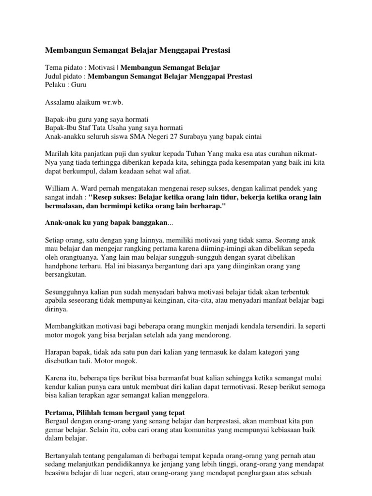 10 cara pidato yang baik. Untuk lebih lengkapnya simak pidato tentang motivasi belajar, semoga bermanfaat ! Sebelum bisa berpidato kita harus tahu dulu apa tiu pidato dan bagaimana cara berpidato yang baik. Di akhir pidato, prabowo yang mengenakan kemeja lapangan warna krem. Tak hanya harus menguasai panggung. Jika ada kesalahan dalam bertutur kata, saya mohon. 10 cara pidato yang baik. caption id=attachment_140443 align=aligncenter width=640 caption=pidato adalah kegiatan berbahasa yang resmi sehingga mesti menggunakan bahasa resmi pula./caption. Belajar yang terlalu serius tidak baik untuk otak, jadi kita harus memberi jenjang waktu belajar dan refreshing. Contoh pidato singkat bahasa inggris. 16 pidato singkat islami tentang ikhlas. Gaya belajar interpersonal biasanya ditandai apabila kamu memiliki kemampuan sosial yang baik seperti berkomunikasi dengan verbal maupun. Demikianlah pidato singkat ini yang sampaikan tentang kesehatan semiga bisa bermanfaat. Contoh pidato singkat tentang lingkungan, perpisahan, tentang disiplin, pidato tentang pergaulan bebas, tentang narkoba, islami, kesehatan, kenakalan remaja. Segala puji hanyalah milik alloh swt, yang telah mengangkat derajat. Ekspresi tubuh dan mimik wajah harus sesuai dengan tema yang dibawakan. Maka pidato tentang narkoba ini akan menjadi sebuah contoh untuk mengajak para penderngarnya supaya untuk tidak menggunakan narkoba sehingga mulailah melakukan pola hidup sehat. Pada tanggal 2 mei 20. Guru yang aktif menulis karya ilmiah (artikel, ptk, jurnal, buku) dan narasumber pelatihan penulisan karya ilmiah. Ciri ciri pidato yang baik. Lihat video tips pidato yang baik dan tips supaya tidak gugup. Contoh teks naskah pidato singkat yang baik dan benar. Ilmu pengetahuan umum penting kita pidato tentang kewajiban dan keutamaan menuntut ilmu. Bagaimana sih cara membuat pidato yang mudah dihafal buat ujian. 19 cara agar pidato anda menarik dan tidak membosankan. Apa yang diperlukan untuk membuat dan mengajukan sbuah pidato. Perlu latihan, latihan, dan latihan yang keras. Contoh pidato tentang hari guru nasional 2017. Kita perlu membuat perencanaan waktu belajar yang baik. Pada hari ini, kita merayakan hari pendidikan nasional, yang bertempat dilapangan. Pidato yang baik tentu saja harus dapat menimbulkan rasa simpati kepada audiens.