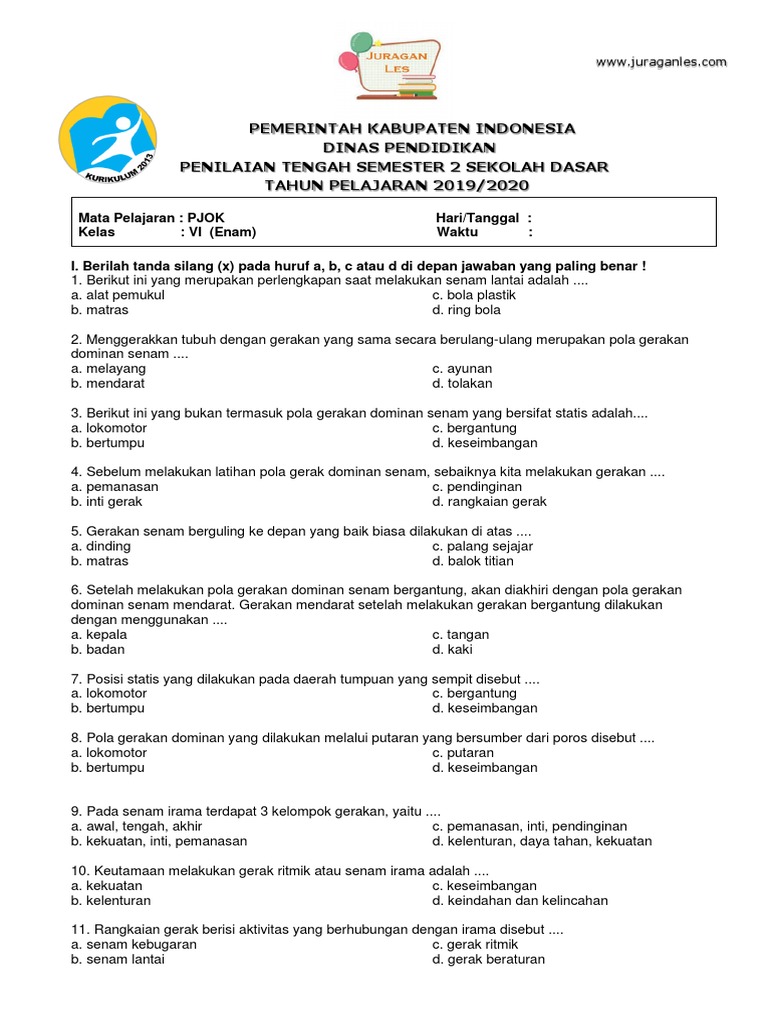 Untuk contoh soal dan kunci jawaban uas penjaskes sd/mi kelas 3 kurikulum 2013. Untuk guru kelas 6, kali ini kami bagikan soal kelas 6 tema 2 subtema 2. Kunci jawaban penilaian tengah semester (pts) ii / genap. Berikut bapak dan ibu dapat melakukan pengunduhan soal latihan usbn jenjang sd (dengan. Kunci jawaban lks penjaskes kelas 1 2 3 4 5 6 sd semester genap. Berikut ini link download soal dan kunci jawaban (pembahasan) latihan pat (ukk) kelas 7 smp kurikulum 2013 tahun pelajaran 2019/2020. Kunci jawaban pts tema 1 kelas vi pkn 1. Soal pts pjok ini sudah dilengkapi dengan kunci jawaban. Bahasa indonesia 10 b 11 a 12 a 13 b 14 b 15 a 16 d 17 masalah utama yang dibahas dalam suatu paragraph 18 makanan pokok. Soal dan kunci jawaban latihan us uas (usbn) penjaskes / pjok sd mi tahun 2020. Soal dan kunci jawaban pat penjaskes smp kelas 7 kurikulum 2013 penilaian akhir tahun pat pada kurikulum 2013 atau ulangan kenaikan kelas ukk pada soal penjas kelas 7 smp mts lengkap dengan kunci jawabannya. Download soal kelas 6 sd mata pelajaran lainnya. Soal uas bisa anda gunaka sebagai referensi dalam belajar untuk mempersiapkan diri dalam menghadapi uas tahun pelajaran 2019/2020. Kunci jawaban penjaskes smp kelas 7 semester ganjil. By azzahra rahmahposted on february 3, 2020. Tulis namamu di sudut kanan atas 2. Untuk kunci jawaban bisa dilihat langsung di bawah soal te…baca selengkapnya. Itulah beberapa contoh soal dari mata pelajaran penjaskes kelas 12 sma/sederajat. Soal kelas 1 tema 2 subtema 1 yang dibagikan pada postingan ini admin sertakan dalam bentuk online dan offline dalam bentuk pdf. Contoh soal matematika kelas 6 sd semester 1. Berikut ini adalah contoh latihan soal pts / uts pjok kelas 6 semester 1 kurikulum 2013 terbaru tahun ajaran 2019/2020. Contoh soal penjaskes sd/mi kelas 6semester 1 & 2. Download soal ujian nasional sd. Website berisi latihan soal tematik kurikulum 2013, soal tema, soal subtema, soal ktsp, soal uas dan uts, soal pas dan pts, download latihan soal serta latihan soal online. Soal ini kakak ambil dari soal ulangan tengah semester dari mata pelajaran pendidikan jasmani dan kesehatan untuk adik adik kelas vi sd/mi berikut bospedia memberikan soal uts penjaskes kelas 6 sd/mi. Lakukan latihan soal ini secara berulang kali agar kamu menjadi terbiasa. Pilihlah salah satu jawaban dari a, b, c, atau d yang paling benar! Ujian sekolah berstandar nasional yang selanjutnya disebut usbn adalah kegiatan pengukuran capaian kompetensi siswa yang dilakukan sekolah untuk seluruh mata pelajaran dengan mengacu pada. Kak hinda sudah buat tryout latihan soal bahasa indonesia kelas 6 dan kunci jawabannya lho! Pada tahap tolakan, posisi lengan pada saat menyentuh peti lompat berada di …. Kegiatan sekolah yang dilakukan di luar jam pelajaran biasa dan.